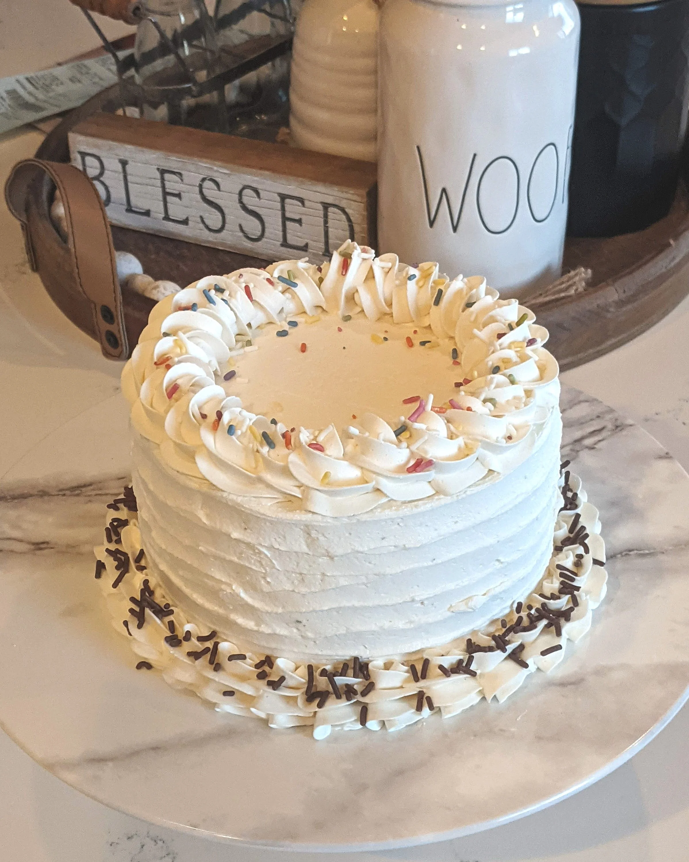 3-tier Vanilla or Chocolate cake with your choice of chocolate or vanilla buttercream.